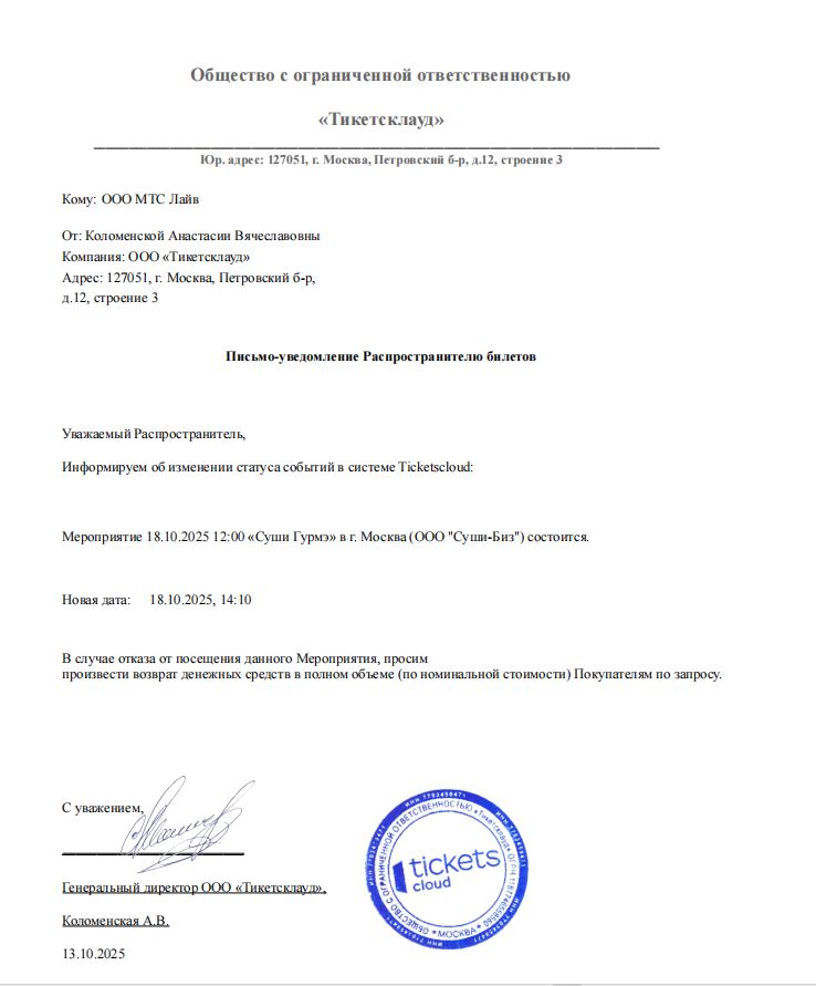 Уважаемый клиент! Спешим сообщить, что по информации, полученной от организатора, мастер-класс «Суши Гурмэ», запланированный на 18 октября 2025 года в 12:00 в Абаканском Дворце Молодежи, перенесен на 18 октября 2025 года, начало в 14:10. Ранее приобретенные билеты действительны на новую дату, обменивать их не нужно. Если вам не удобно посетить мероприятие, вы можете вернуть билет по кнопке в личном кабинете во вкладке «Заказы». Деньги за электронные билеты вернутся автоматически в полном объёме на карту, с которой была произведена оплата. Если вы купили билет в кассе Ticketland.ru за наличный расчет, то обратитесь, пожалуйста, на почту: vozvrat@ticketland.ru. С уважением, команда поддержки Ticketland.